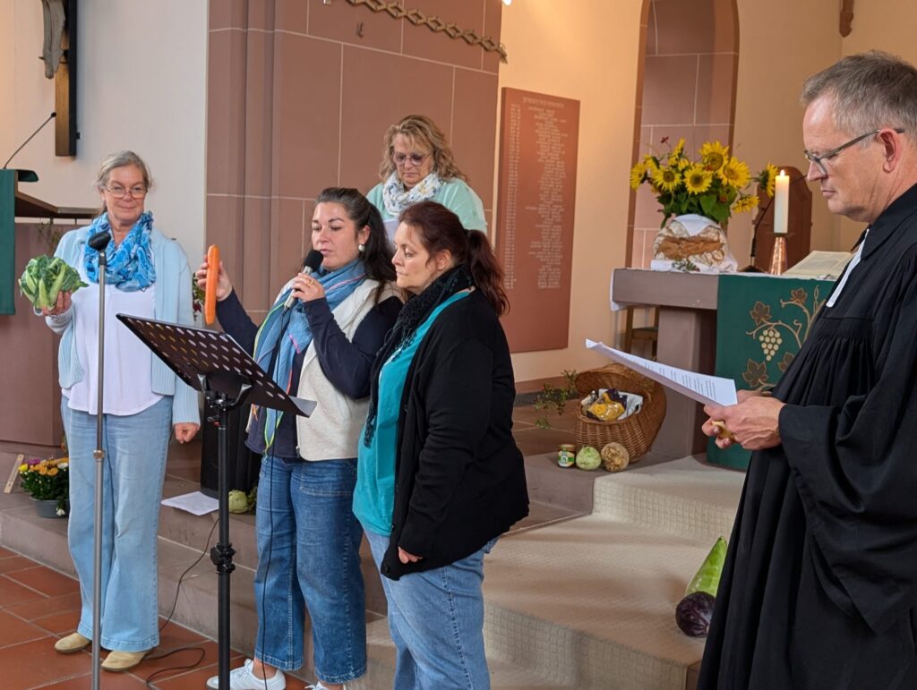 Diese Gelegenheit haben wir auch unseren Gästen der Tagespflege gegeben. Mit Pfarrer Elsässer veranstalten wir in der Marienkirche einen Erntedankgottesdienst. Verschiedene „Gemüse“ (durch unsere Mitarbeiter dargestellt) führten ihre Vorzüge per Sprechmotette zur Schau und erfuhren auch ihre Grenzen im Dialog der „Gemüse“.