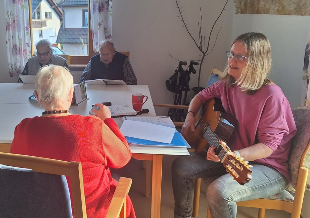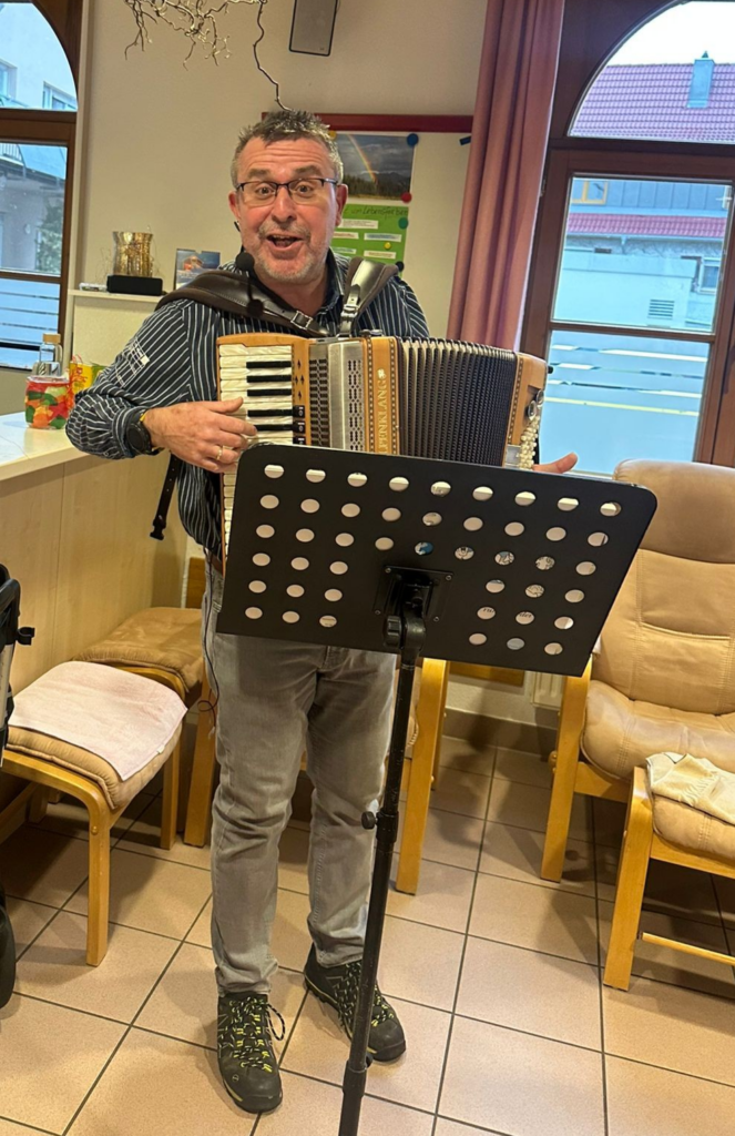 Ich freue mich außerdem sehr, dass unser Mitarbeiter Frank Mohr seit diesem Jahr vom Krankenpflegeverein Keltern unterstützt wird und regelmäßig mit seinem Akkordeon musikalische Nachmittage gestaltet. Ebenso bereichert Ellen König mit ihrer Veeh-Harfe den Alltag unserer Gäste und gibt ihr Wissen derzeit an unsere motivierte Kollegin Michaele Girrbach weiter. Ein echtes Geschenk ist auch Kerstin Dill, die einmal wöchentlich ehrenamtlich mit ihrer Gitarre vorbeikommt und unsere Tagesgäste beim Singen begleitet.
